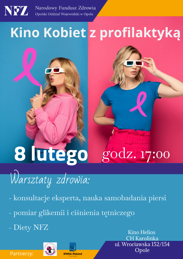 8 lutego 2023 r. serdecznie zapraszamy do Kina Helios w CH Karolinka na warsztaty zdrowia pod hasłem „Kino Kobiet z Profilaktyką”.
