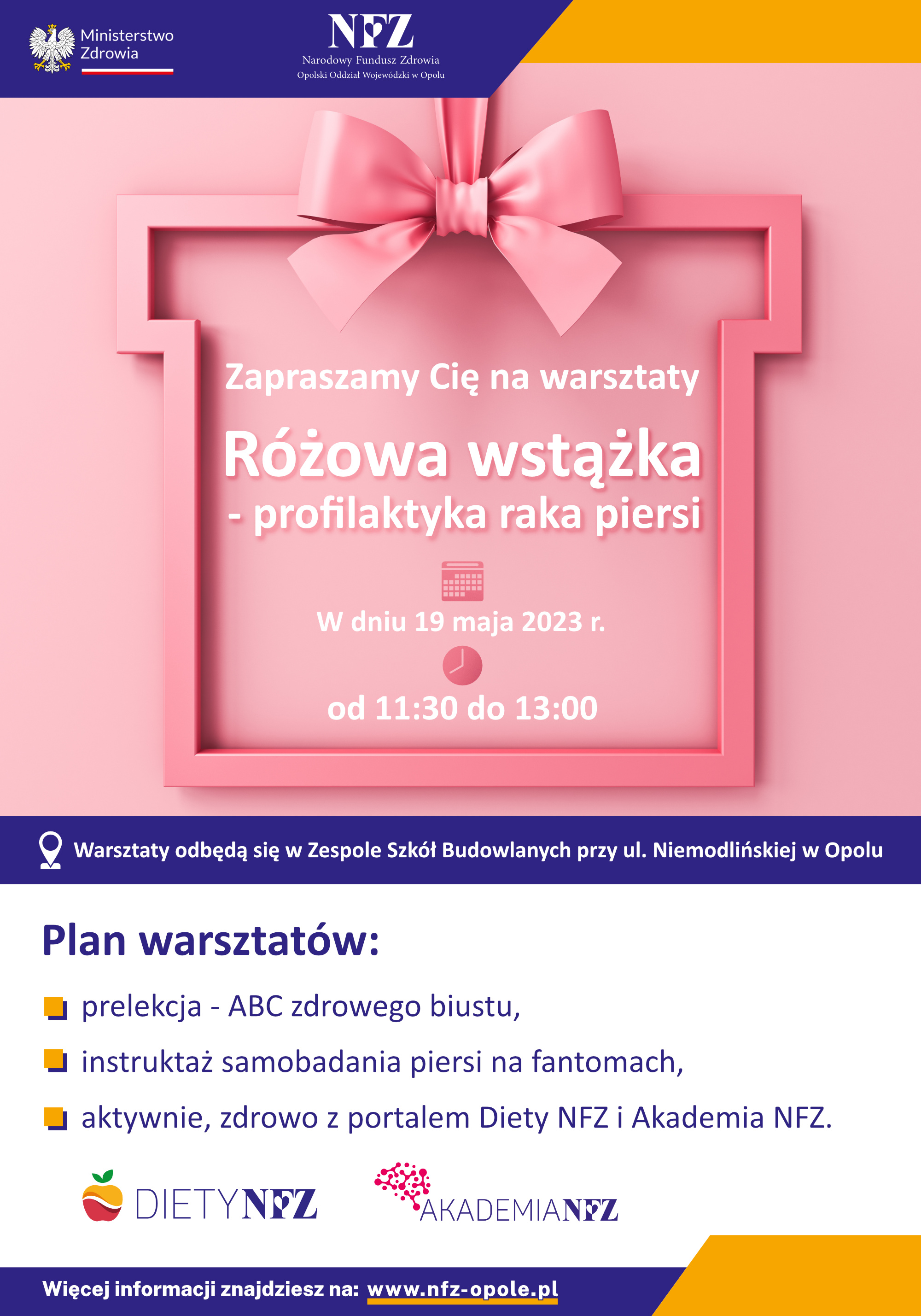 19 maja 2023 r. Opolski Oddział Wojewódzki NFZ organizuje warsztaty zdrowia pod hasłem „Różowa wstążka – profilaktyka raka piersi” dla uczennic Zespołu Szkół Budowlanych im. Papieża Jana Pawła II w Opolu.