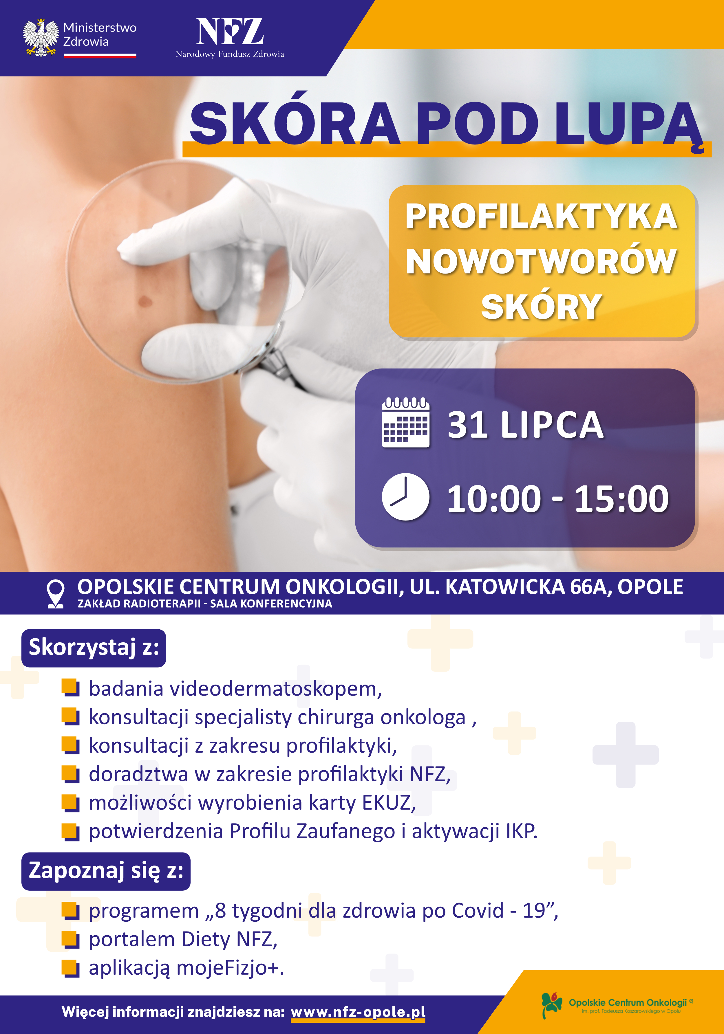 Opolski Oddział Wojewódzki NFZ wspólnie z Opolskim Centrum Onkologii zaprasza na II edycję akcji zdrowia pod hasłem „Skóra pod lupą. Profilaktyka nowotworów skóry” w dniu 31 lipca 2023 r.