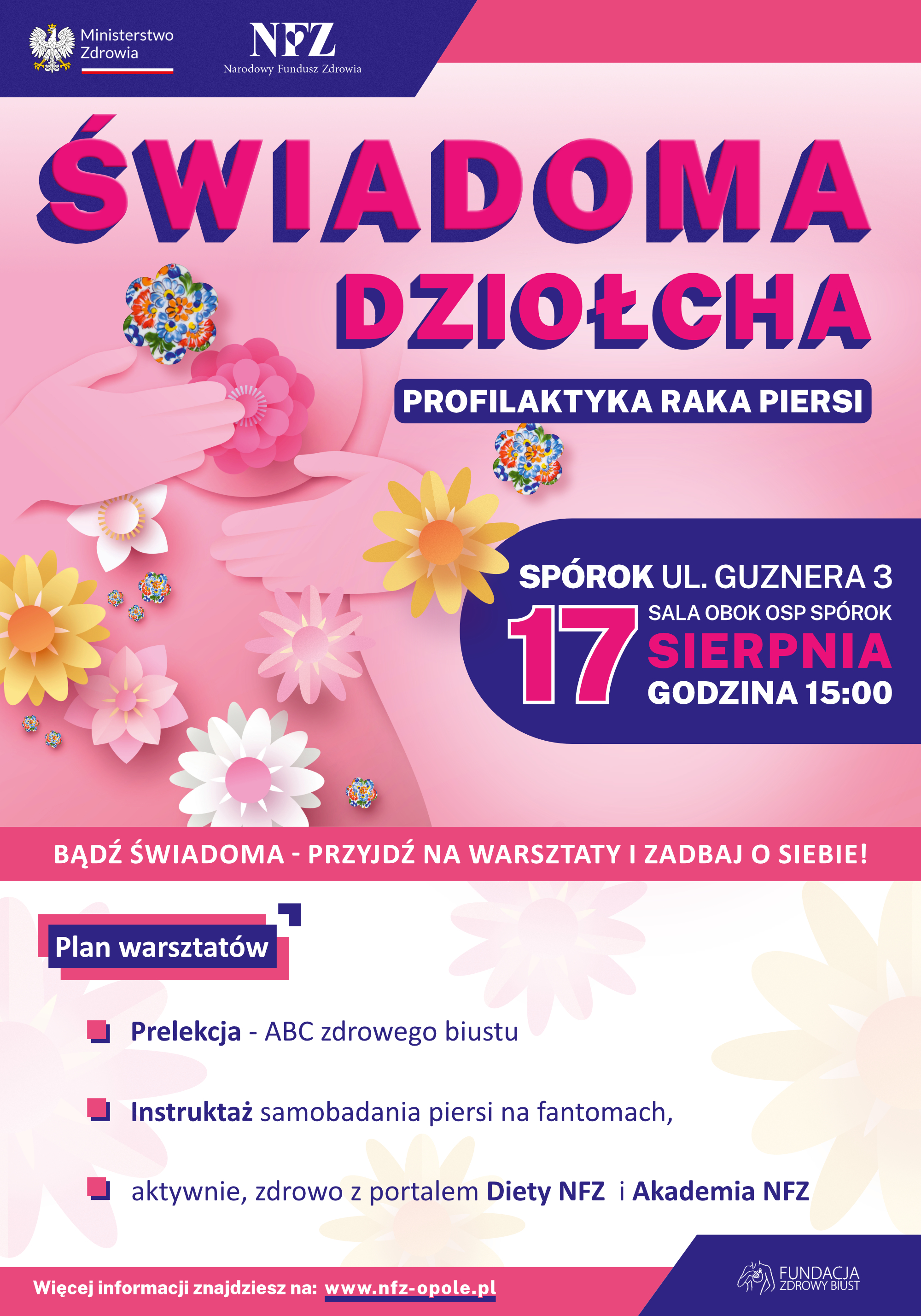 17 sierpnia 2023 r. zapraszamy do udziału w warsztatach zdrowia dla kobiet „Świadoma Dziołcha. Profilaktyka raka piersi” w Spóroku, gmina Kolonowskie.